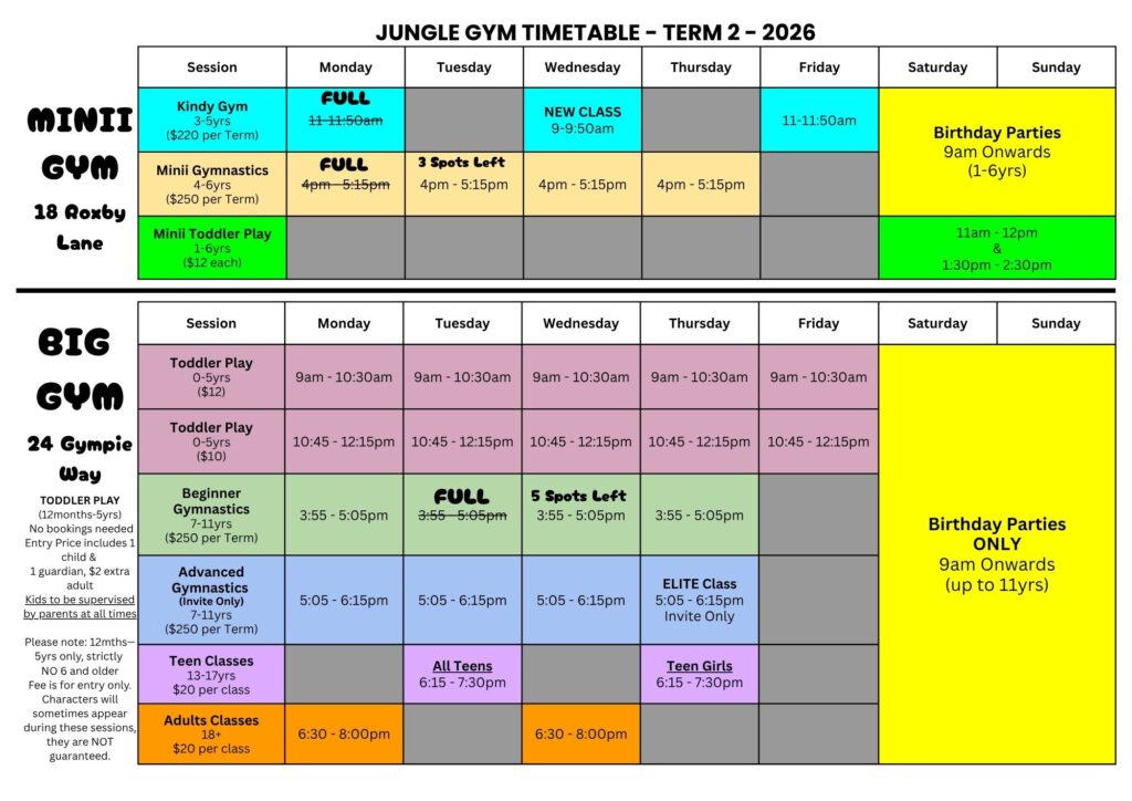 Birthday Bookings for 2026 now have the option to select your preferred party room & update party numbers online. Gymnastics Classes are also now able to be booked through the new booking system.